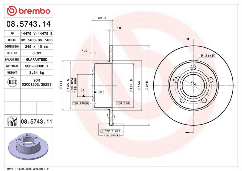 BREMBO 08.5743.11 - Disco de freno - PRIME LINE - UV Coated
