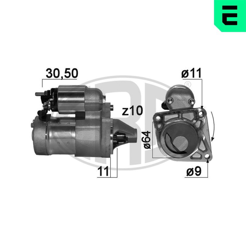 Tensión [V]: 12 Potencia nominal [kW]: 1 Número de dientes: 10 ID del modelo de conector: 30-50 Sentido de giro: Sentido de giro a la derecha (horario) Diámetro de brida [mm]: 64 Cantidad de agujeros de fijación: 2 Tipo de combustible: Gas líquido (LPG) Posición básica piñón [mm]: 11