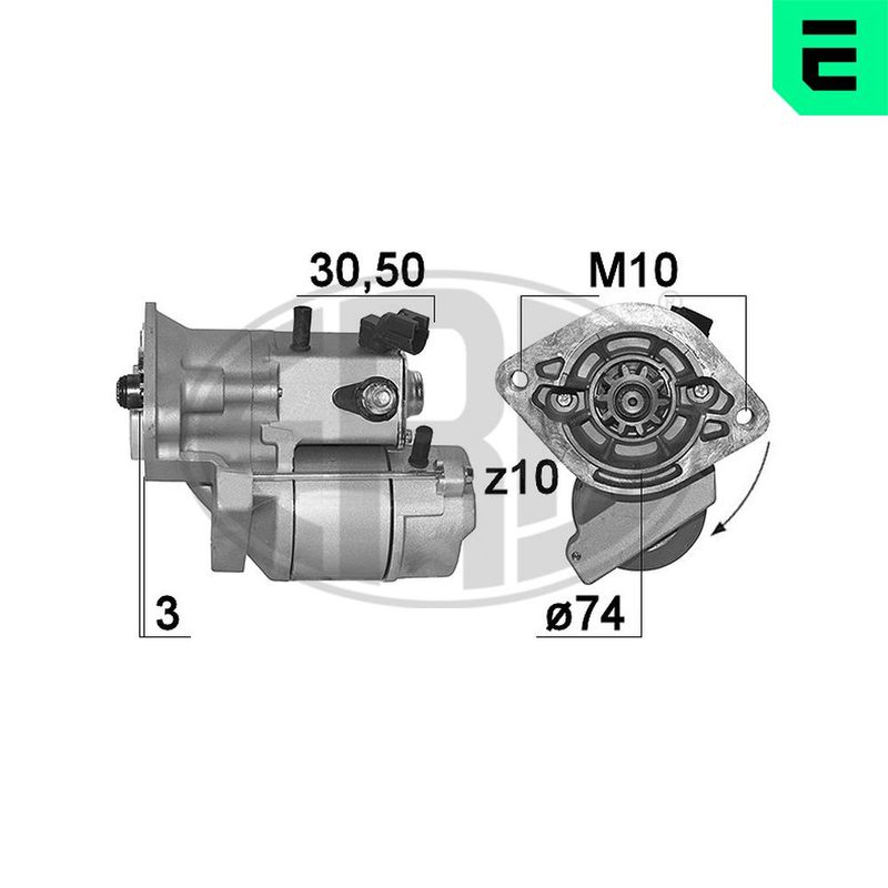 Tensión [V]: 12 Potencia nominal [kW]: 1,4 Número de dientes: 10 ID del modelo de conector: 30-50 Sentido de giro: Sentido de giro a la derecha (horario) Diámetro de brida [mm]: 74 Versión: OSGR Cantidad de agujeros de fijación: 2 Posición básica piñón [mm]: 3